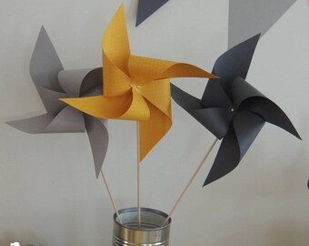 Set of 10 pinwheels in yellow, light grey and dark grey wind