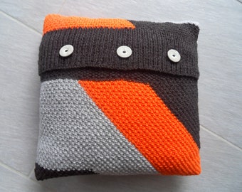 Soda cushions, hand-knitted, light grey, dark grey and orange