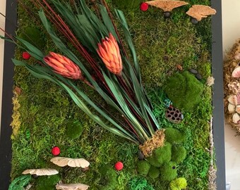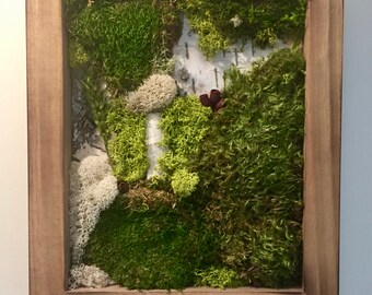 • Includes: The Sandwood Branch, ferns and a variety of moss. Reclaimed wood frame in rustic grey. Hanging hardware attached.