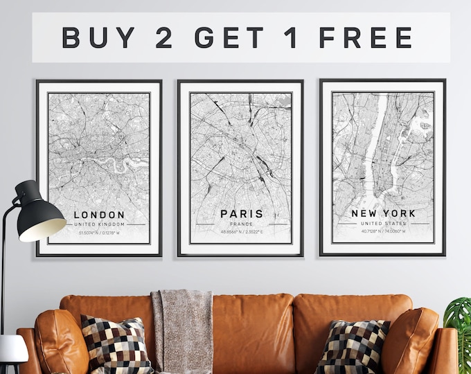 Impresiones de mapas de ciudades, personalizadas, 3 por el precio de 2. Póster de mapa de arte de pared moderno en tamaño 50 x 70 apto para marco de Ikea. Todas las ciudades disponibles.