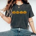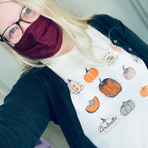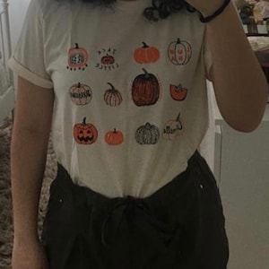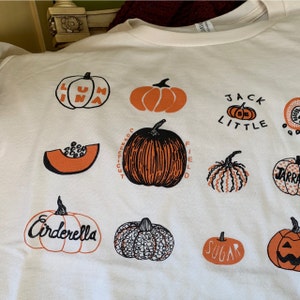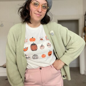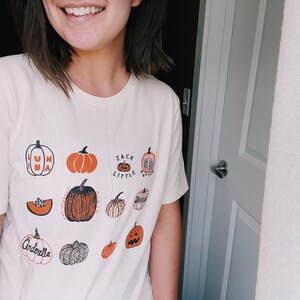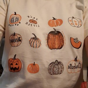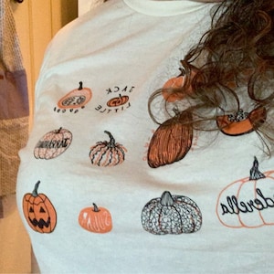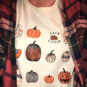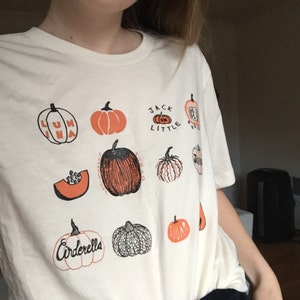 This vegetable tee features hand drawn pumpkins. The shirt shown here is Natural and printed in black and orange ink.
