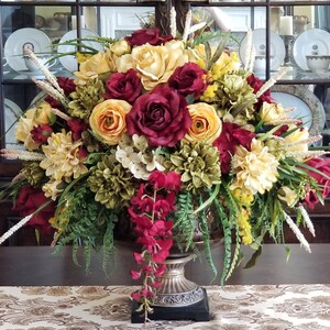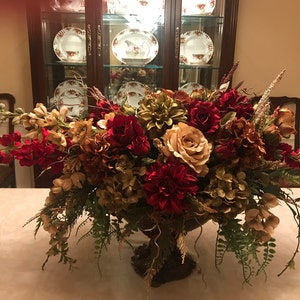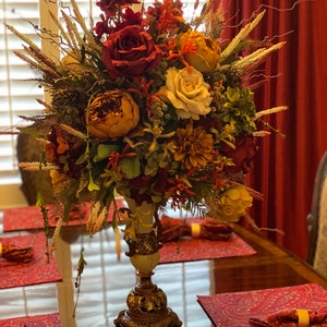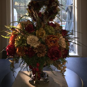 Received this over the weekend and it's simply beautiful. The original vase was a little different shaped but this one is taller and fuller which I was hoping for. The owner filled it full of "feel real" white roses, daffodils, green and yellow flowers. They actually are so soft they really do feel real. They are arranged in a lovely ceramic cracked vase and its gorgeous. Vendor was so kind and didn't charge more for the extra flowers! It's a beautiful arrangement as all of her pieces are. When I want something for the holidays, I know where I will go. My first time purchase and hopefully not my last. She was also very helpful!🌹🍃