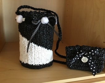 • Small bucket bag/bag Pom Pom Duffel black/white/graphic bag/handbag/shoulder bag/hand/single crocheted/upcycling