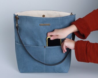 • Blue Canvas Tote Bag, Bucket Bag, Blue Bag, shopping bag, Casual Tote Bag, Handbag, Leather strap, Blue bucket bag, Lagut, Weekend Bag, bags