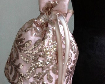 • Elegant handmade shoulder Bag in pink fabric with sequins, small bucket bag perfect as an accessory for ceremony