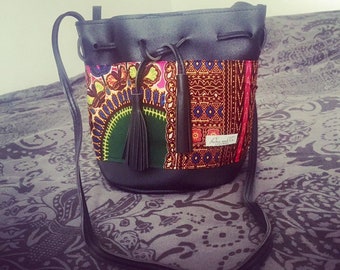 • Small bucket bag black leather leather bandouliere customizes wax pink fabric dashiki