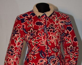 • Navy and Camel Floral on Red w/Patch Pockets, Camel Reverse w/Navy Piping in Princess Seams, Reversible Fleece Coat