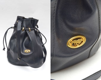 • Vintage 90's Genuine Dark Blue Leather Bucket Shoulder Bag with Gold Metal Mustang Logo