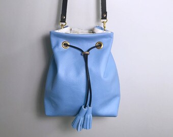 • Baby Blue Leather Mini Bucket Bag - Genuine Leather Bucket Bag - Leather Purse - Blue Shoulder Bag