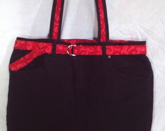 Upcycled Black Denim Tote, Shoulder Bag, Top Handle Bag, Black Denim, Red Belt, Market Bag, Denim Bag