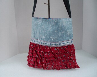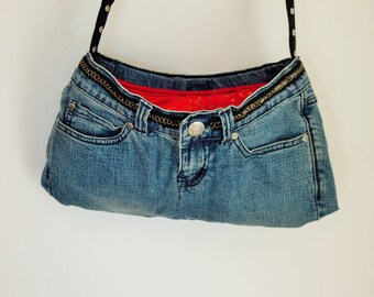 Denim Handbag/Upcycled Jeans/ Blue Denim and Red with Gold Stars/vintage look