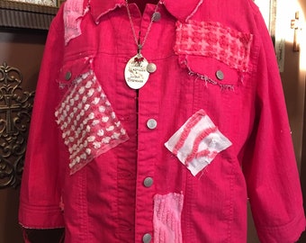 Women's Jacket Upcycled Denim Red ish Vintage Chenille