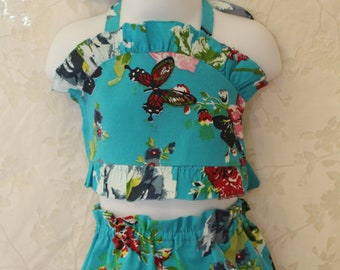 Handmade new top and shorts bathing suits size 2-3T aqua color and floral beach wear ready to ship toddlers girls babies jumper rompers