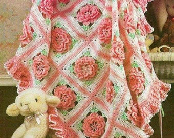 Vintage Crochet Pattern Pretty Ruffles & Roses Baby Afghan Granny Square Flower Motif Blanket PDF Instant Digital Download 5 Ply
