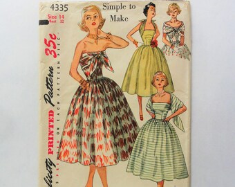 Misses cocktail dress full skirt, fitted bodice, sleeveless attached scarf wrap 1950s vintage sewing pattern Simplicity 4335 size 14 bust 32