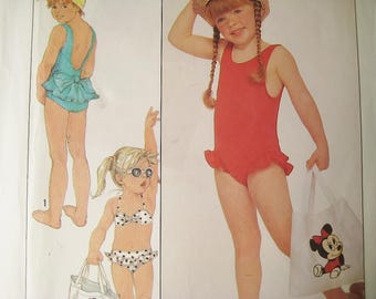 Simplicity 8655 Toddler Minnie Mouse Swimsuit Bikini Beach Tote Bag Bathing Suit Back Bow Ruffles Disney Babies Applique Child Size 3 UNCUT