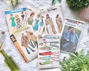Vintage Sewing Patterns, 1960s Simplicity, 1980s Vogue Jacket, Mod Clothing Designs, Uncut Retro Blouse, Embroidery Transfers, 1970s Poncho