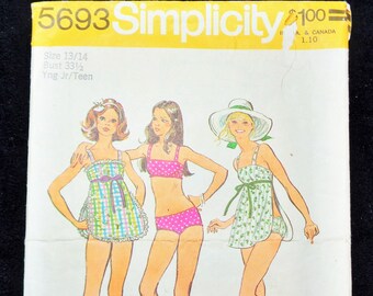 Vintage SIMPLICITY #5693 Young Jr/Teen Bathing Suits Size 13/14 Bust 33-1/2'' Sewing Pattern 1973