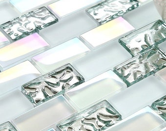 Iridescent White & Silver NB04-11.6"x11.6"/Sheet Glass Subway Tile 1x2, Matte Mix Glossy Glass Backsplash Tiles for Kitchen or Bathroom Wall