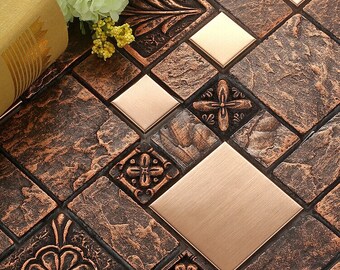 Antique Copper Bathroom Tile B963-11.6"x11.6" Per Sheet, Rock Surface Resin Mosaic Wall Tiles, Glass and Stainless Steel Backsplash Tile