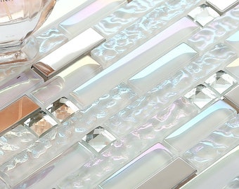 Iridescent White & Silver, NB01-12"x11.8"/Sheet Glass Mix Stainless Steel Backsplash Tiles, Mirrored Metal and Rhinestone Mosaic Wall Tile