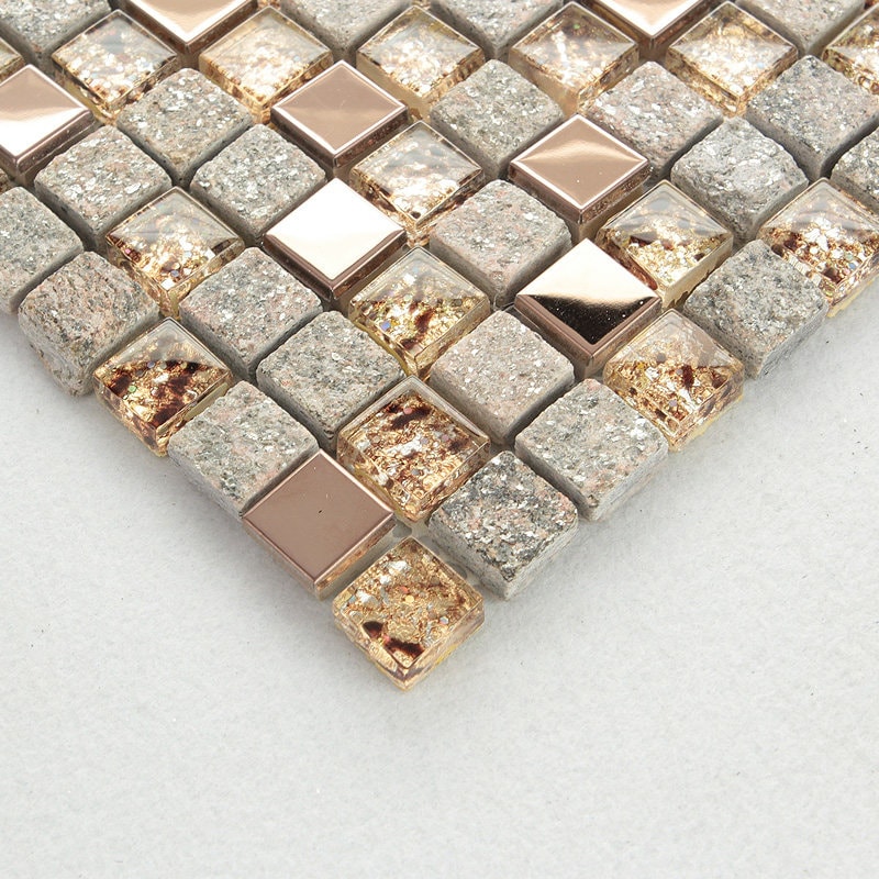 stone mosaic, clear glass tile, rose gold metal, stainless steel mosaic, ceramic bases, mosaic tile, backsplash tile