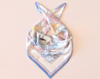 White striped lightweight cotton square scarf with writing and illustration screen printed by hand.