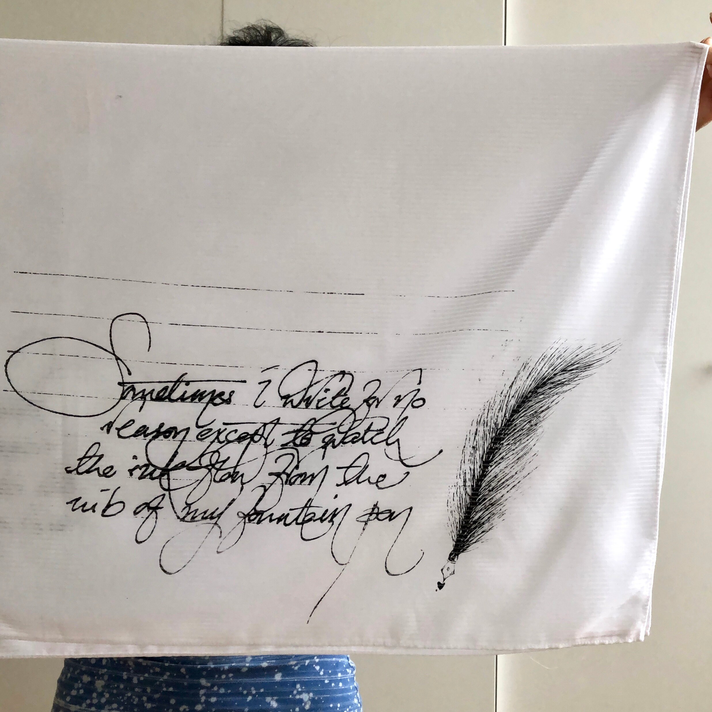 The original artwork is my own drawing and handwriting that I turned into a screen print. The print is heat fixed and this scarf can be washed and ironed.