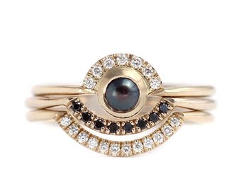Pearl Engagement Ring with Diamonds, Three Rings Wedding Set, Pearl Wedding Ring Set, Alternative Wedding Set, Black And White Diamonds Set