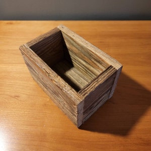 Each box is absolutely unique and no two will ever be the same. All vintage wood is different and as such will have unique markings, grain patterns, nail holes, stains, chips, breaks, staples, splits and even lettering. As this is reclaimed wood the oil stain takes differently to all woods and will vary in darkness of the color in the wood (from light brownish red to medium brown to really dark brown/almost black). If you are looking for a specific color then please message me. Please see the pictures for further details!