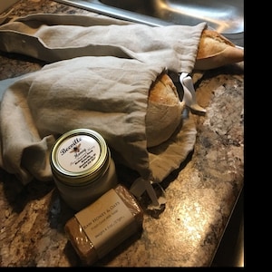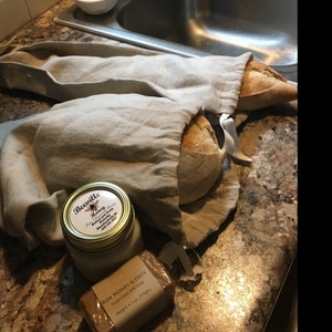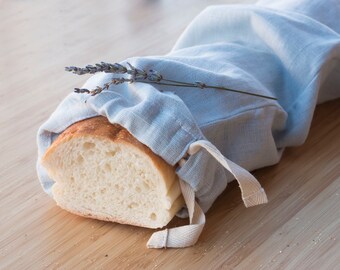Linen bread bags keep your homemade bread and bakery bread fresh. These bags are made from 100% linen that has already been machine washed and dried to prevent further shrinking. The bags are available in three sizes to fit most breads: Baguette ( 8 X 20); Round Boule (12 X 12); and Loaf (12 X 17). The seams are finished with a serged edge to prevent raveling. The bags all close with a double drawstring to really cinch it closed.