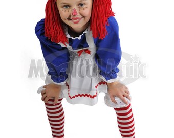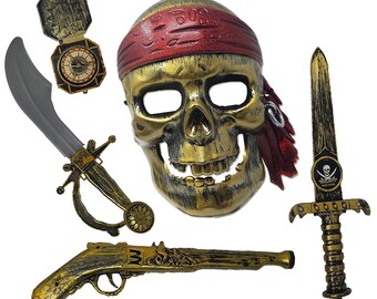 This beautiful PIRATE GIRL costume set includes the following: WHITE, peasant top with puffed sleeves finished with WHITE lace and satin RED ribbons, full double layered skirt with elastic at waist, top RED/WHITE striped skirt finished with BLACK ball fringe, RED skirt has 4 handpainted BLACK skulls and trimmed with BLACK guimp, BLACK lined corset finished with RED ric rac trim and GOLD rope, RED headscarf/bandana comes with handpainted skull and BLACK fleece hooded cape finished with GOLD decorative trimming.