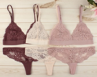 Floral Lace Bralette Thong Set - multi colors - lacy bra panties, lingerie sets, women's underwear