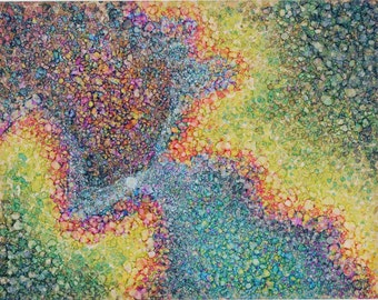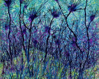 This painting was created by using alcohol inks and India inks. I used small droplets of India ink, which I blew across the paper through a straw, to create the image you see.