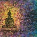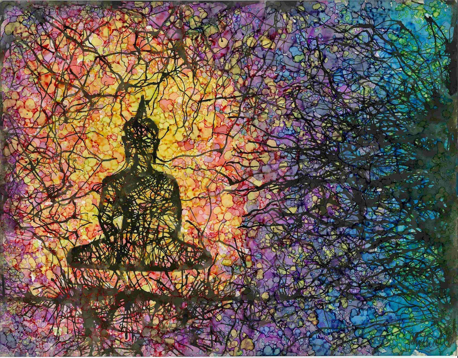 Emanating light and surrounded by darkness, this meditating monk rises above the reaches of doubt and suffering in enlightenment. Silhouetted against vibrant hues of yellow and warmth, he repels the darkness that reaches toward him.