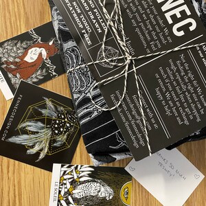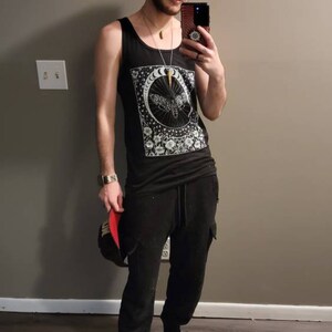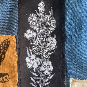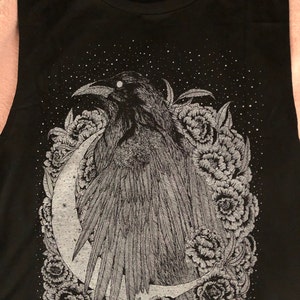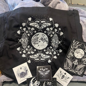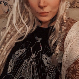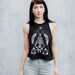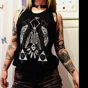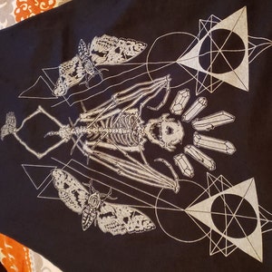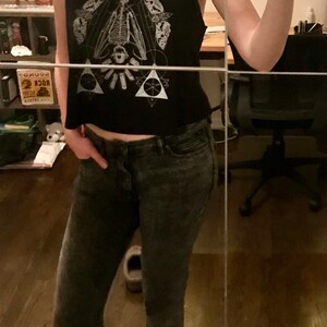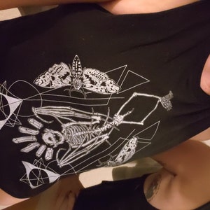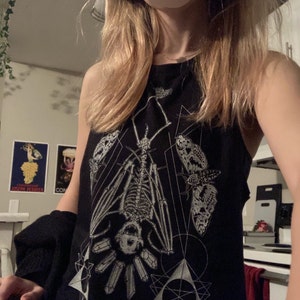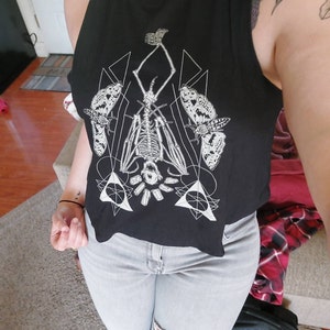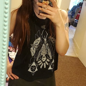 This detailed and soft black crop top features detailed original artwork of a hanging bat skeleton, moths, crystals, and geometric elements. The design is a hand pulled screen print in non-toxic water based white ink and has been heat set for durability. 52% cotton, 48% polyester. Machine Washable.