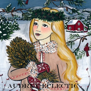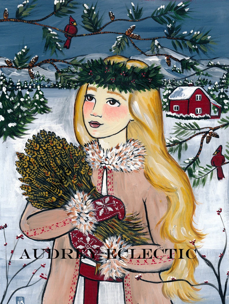 God Jul! If you love Scandinavian Christmas and the traditions of St. Lucia, you'll love this spritely St. Lucia, taking out a bouquet of wheat to feed the pretty winter birds.
