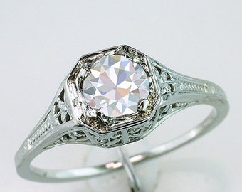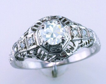 Antique Diamond Engagement Ring GIA Certified .55ct 18K White Gold Art Deco