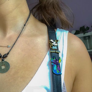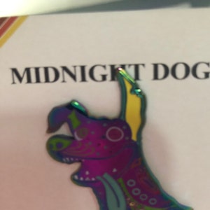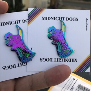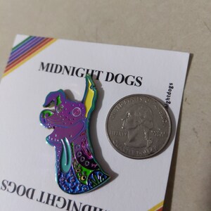 1.5" Soft Enamel Pin. Rainbow Anodized Metal. Two pin posts on the back with pink rubber stoppers.
