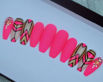 Black with glitter and aztec design LUXURY PRESS ON, freehanded, press on nails, glue on, handpainted nails, stiletto nails -