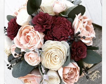 Unique wedding bouquet full of natural sola wood flowers. The wooden flowers are hand dyed in shades of pale blush pinks. Navy blue berries, tons of mixed greens and green eucalyptus finish off this forever beautiful bouquet. This bouquet is made to order and can be customized how you like for your big day! Add another pop of color or something you had in mind. The wire stems are then wrapped in ivory satin and finished off with a creamy double satin knot.