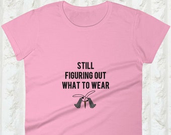 Still Figuring Out What to Wear | Dark Humor Girly T-Shirt Quote with Mosquito Graphic | Funny Fashion Saying Tees for Women | Cute Gifts