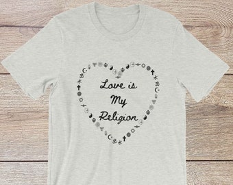 Love is My Religion | Love Quote Print Shirt | Peace Heart Graphic Tee | Positive Sayings Yoga T-Shirt Gift in Black Text - Sizes - S-4XL