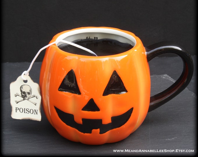 Jack O Lantern Candle | Happy Halloween Coffee Mug / Tea Cup | Pumpkin Pie Scent | Poison Skull Tea Tag | Spooky | Halloween Decoration