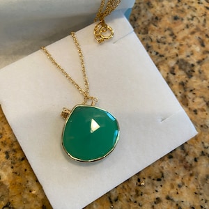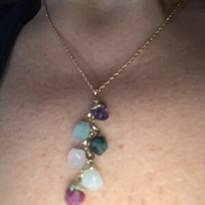 5 out of 5 starsI bought 2 of these necklaces - one was a pink tourmaline for my sister and a raw emerald for me (my birthday). I wear it as a casual piece so it is worn everyday. The quality of the stone and chain is outstanding. The color of the stone goes with many other colors - interestingly it looks great with blue. My expectations were met so well that I am picking out earrings to match for my husband to give me as a present! Lol I really like the creativity of this design and that they are hand made.