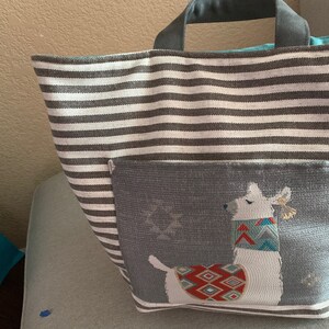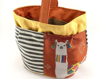 MamaLLama Hope Basket is an eye catching design by Atenti with the most adorable llamas in a warm burnt orange. This Atenti needlearts fabric basket is a super organizer for your crafting project needs with two outer pockets and Five inside pockets! This spacious striped fabric basket holds over 6 hanks of super bulky yarn and the handy outer pockets help you access your yarn, knitting, crochet or sewing notions in an easy to reach location. This wide opening fabric bucket bag has two burnt orange Ultra-Suede short handles and has a lined inner or outer edge in a golden vegan Ultra-Suede. The interior of this large cloth basket is fully lined in a light tan water repellent taffeta.