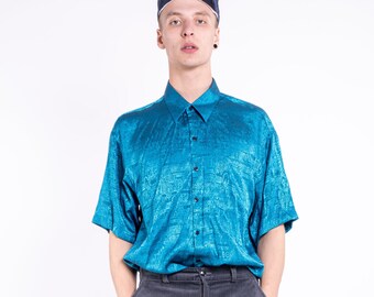 VINTAGE Blue Shiny Patterned Retro Shirts
