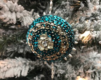 Vintage beaded sequence jeweled sky blue shiny Christmas ornament