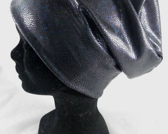 Bas063 - Bonnet de chimio noir reflets bleus brillant effet peau de serpent