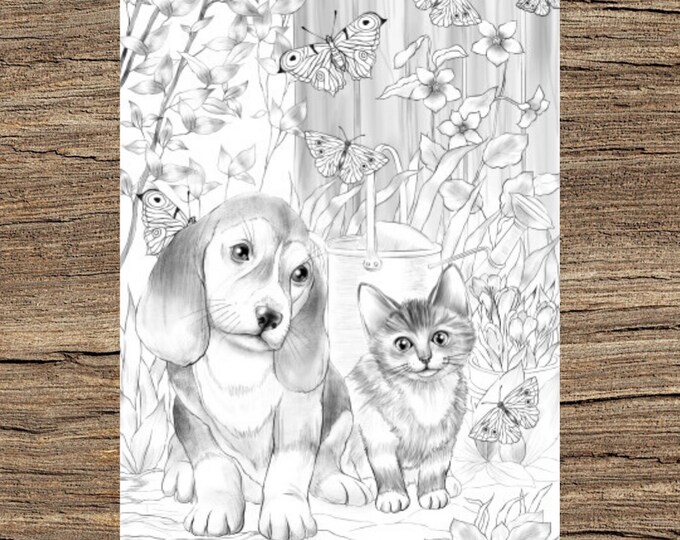 Kitty and Dog - Printable Adult Coloring Page from Favoreads (Coloring book pages for adults and kids, Coloring sheets, Coloring designs)